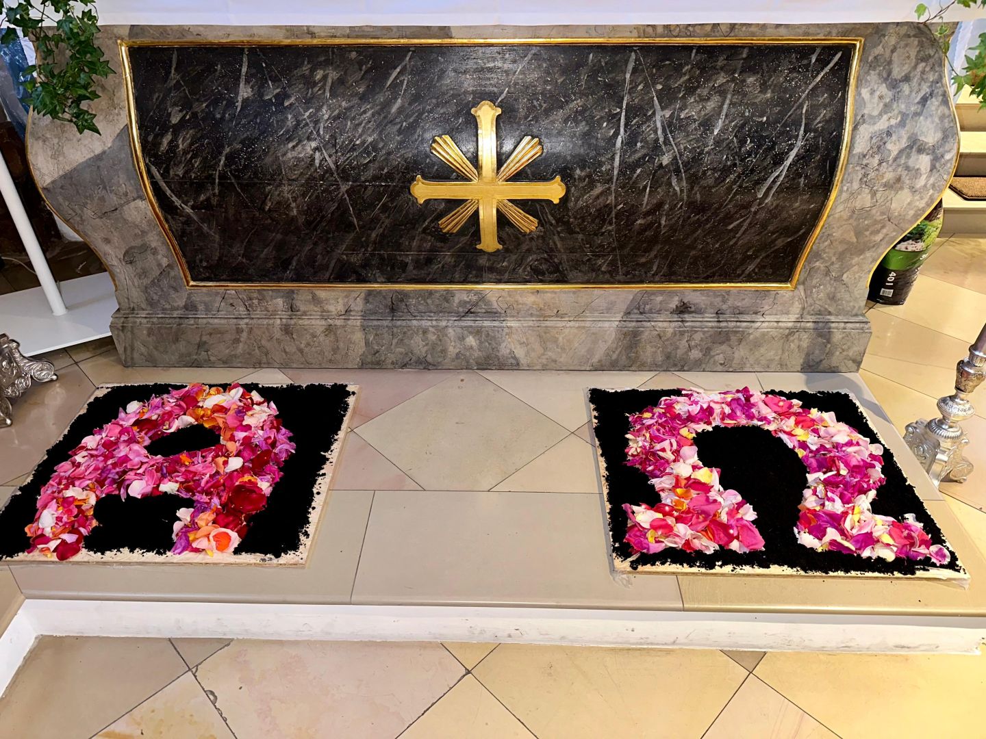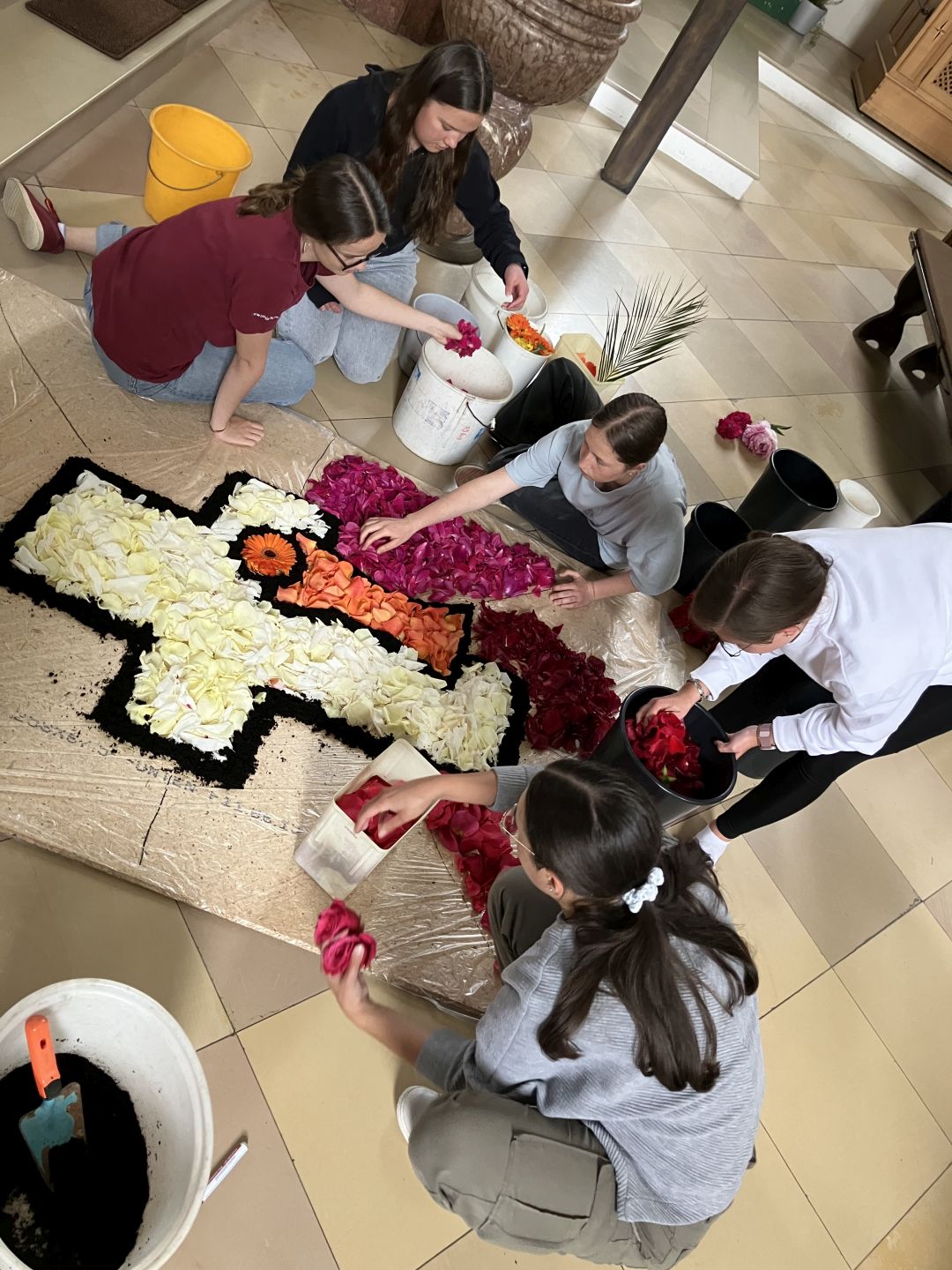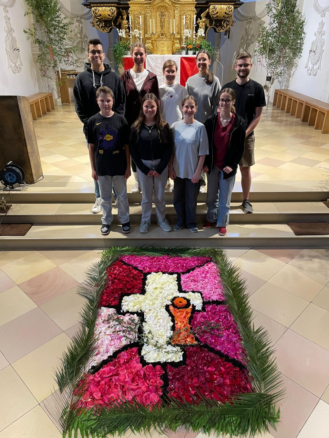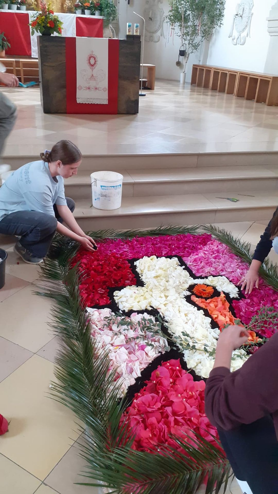 Für den Festgottesdienst an Fronleichnam haben wir am Vorabend drei Blumenteppiche gelegt.