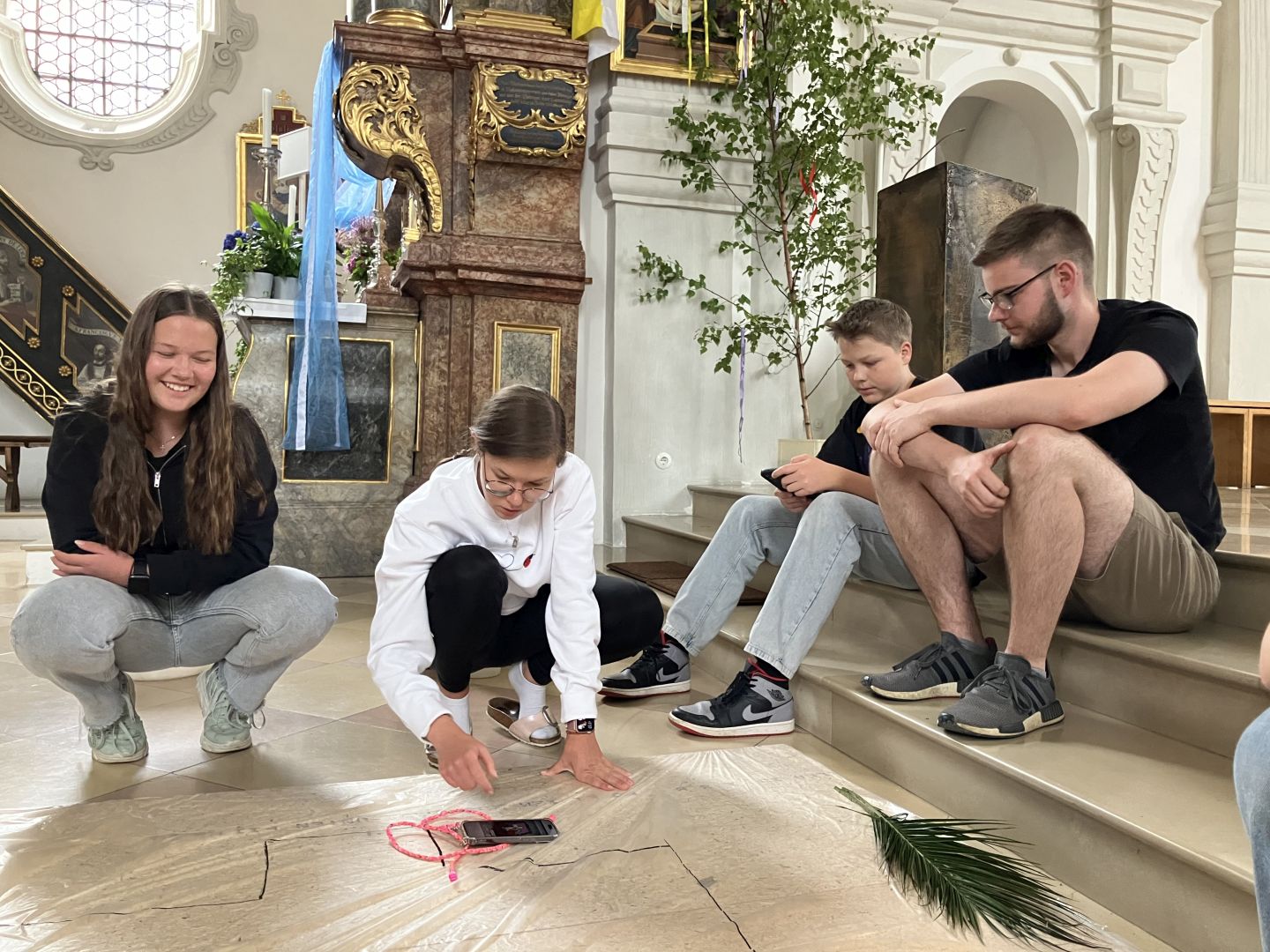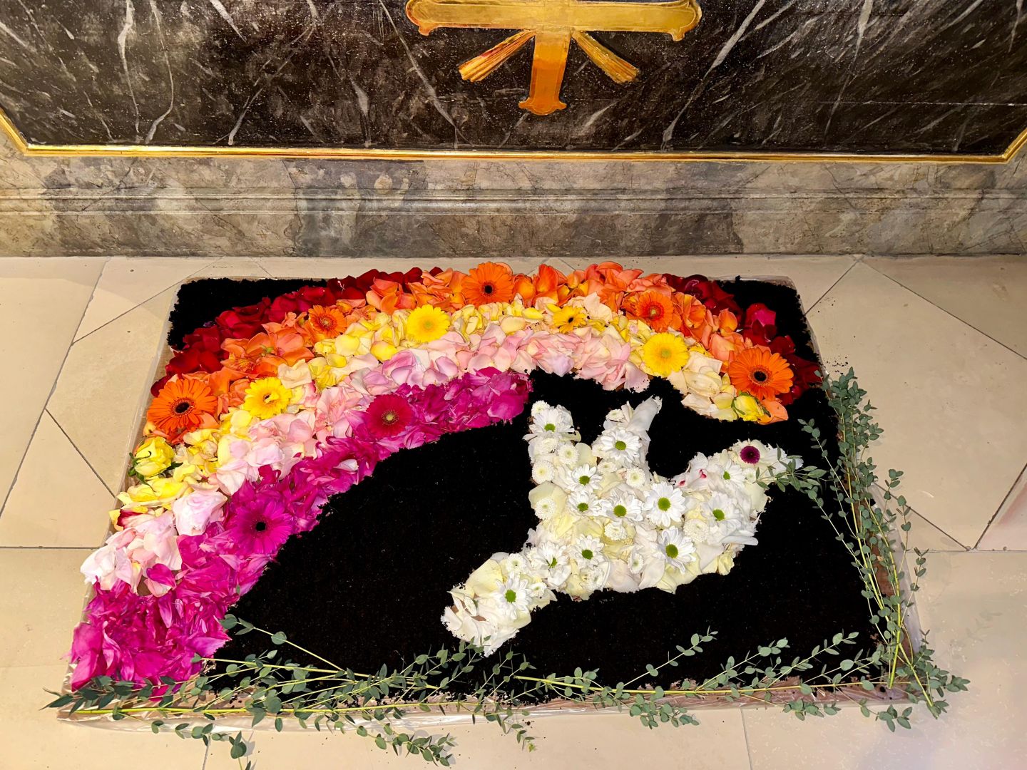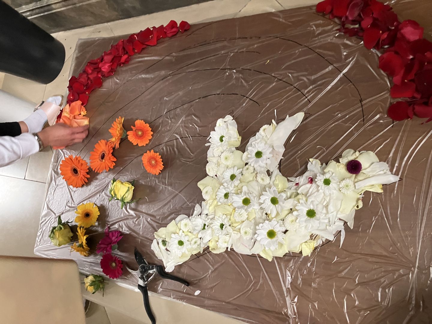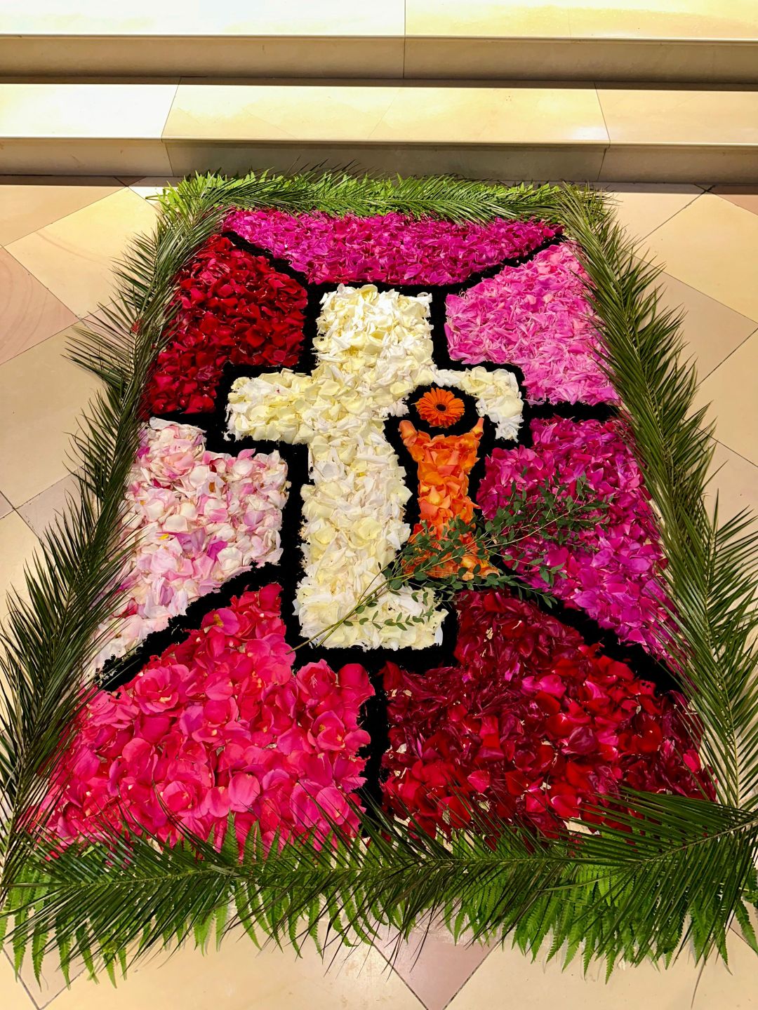 Für den Festgottesdienst an Fronleichnam haben wir am Vorabend drei Blumenteppiche gelegt.